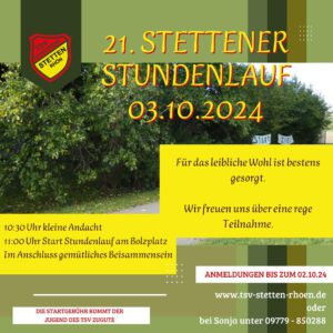 Dorfrunde 202410.11.2024 21. Stettener Stundenlauf3.10.2024 20. Stettener Stundenlauf3.10.2023 18. Stettener Stundenlauf3.10.2021 17. Stettener Stundenlauf3.10.2020 Stettenturnier 2019 in der Rhön7.6. – 10.6. 2019 Mehr Bilder